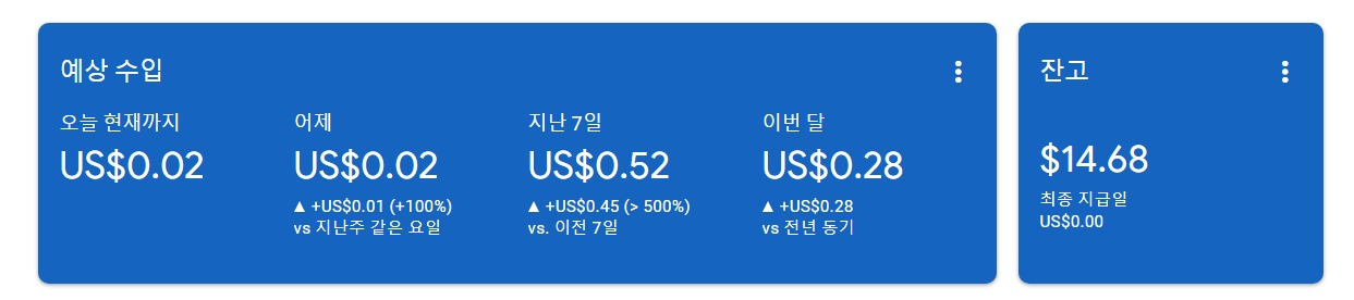 근데 사람욕심이 그전에는 반응이라도 있길 바랬는데, 지금은 이왕이면 10달러는 들어왔으면 좋겠다는 생각을 하고 있습니다. 4개월차는 확실히 0.01달러 이상이 꾸준히 들어 오고 있구요.